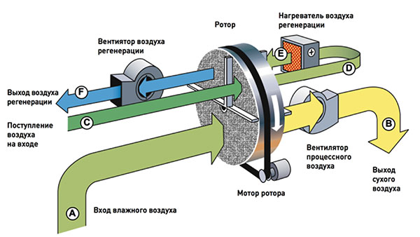 В составе прибора функционирует два независимых потока воздуха – рабочий воздух и воздух регенерации. Первая прокачивает через устройство осушаемую воздушную среду, вторая – подаёт на ротор горячий воздух регенерации.